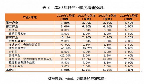 以上預測已經包含了疫情沖擊下的替代性增長,創新性增長、增長延遲和政府已經出臺的穩增長措施的影響。比如,在批發零售業評估中,充分考慮了線上消費對線下消費的替代;在信息技術等相關行業預測中,充分考慮了疫情的沖擊會加快5G通信、云計算、人工智能、機器人、工業互聯網等行業的增長;在制造業和建筑業預測中,也包含了延遲增長和政府已經出臺的穩增長政策所產生的對沖效應,其中新增專項債、減免企業社保、保險費、緩繳住房公積金等政策對于提振企業信心的積極效果等因素,全年對GDP的拉動作用有望達到0.3個百分點左右。