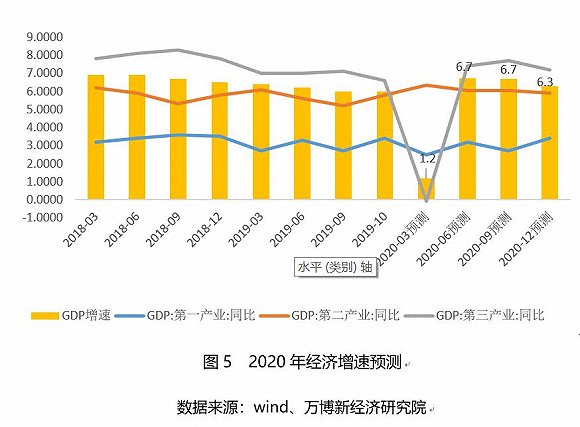 制造業、建筑業、采掘業等雖然受停工影響,2月份損失較大,單月負增長,但是考慮到疫后恢復快,3月份基本全部復工復產,且可加班回補,因此只要全年總體需求受影響不嚴重,雖然一季度第二產業增速短暫回落,但全年增長受影響不大:預計制造業全年增加值可達283929億元,全年同比增速為5.5%;預計建筑業及其他第二產業全年同比增速為5.4%。