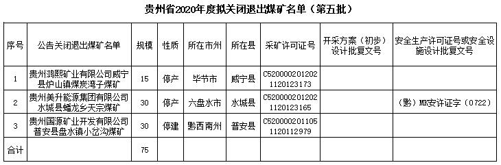 貴州省能源局日前發布貴州省2020年度第五批擬關閉煤礦名單,名單涉及煤礦3處,合計產能75萬噸。