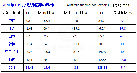 1-11月,澳大利亞動力煤出口累計為1.85億噸,比上年同期下降5.4%。其中,出口中國3472萬噸,同比下降22.4%;出口日本6518萬噸,同比下降4.3%;出口韓國3019萬噸,同比下降10.5%;出口我國臺灣省1997萬噸,同比下降10.3%。而同期出口到印度和越南的煤炭大幅增長,出口印度624萬噸,同比增長97.3%,幾乎翻了一倍;出口越南1285萬噸,同比增長38.8%。
