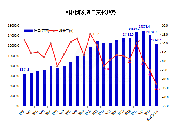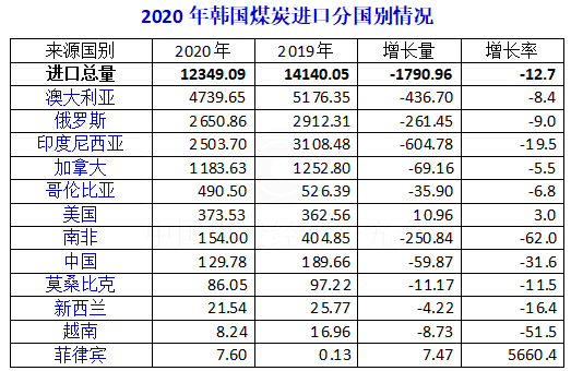 據韓國海關(Korea Customs Service -KCS)發布的統計數據,2020年1-12月韓國煤炭進口12349.1萬噸,同比減少1791萬噸,下降12.7%。