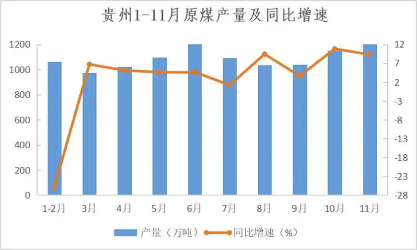 公開數據顯示,2020年1-11月,貴州原煤產量10742.2萬噸,位列全國第五。預計全年全省調度原煤產量12100萬噸,供應電煤7000萬噸。截至11月底,電廠電煤存煤量達1100多萬噸,徹底改變冬季電煤供應緊張狀況。