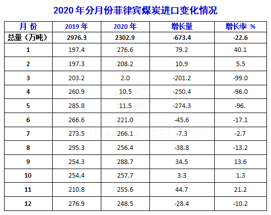 據菲律賓財政部海關局The Bureau of Customs(BOC)發布的初步統計數據,2020年12月,菲律賓煤炭進口248.5萬噸,同比減少10.2%,環比下降2.8%。1-12月,菲律賓煤炭進口累計為2302.9萬噸,仍然保持突破2000萬噸,但比2019年大幅下降,比上年減少673.4萬噸,同比下降22.6%。