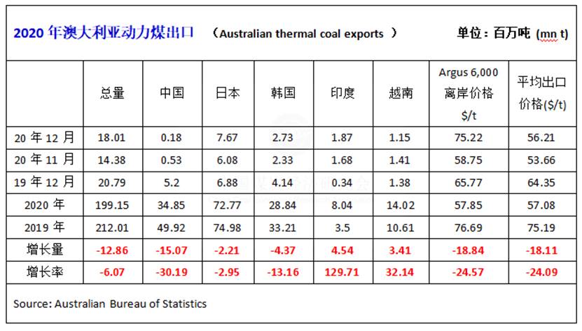 據(jù)阿格斯(Argus)援引澳大利亞聯(lián)邦統(tǒng)計局(Australian Bureau of Statistics —ABS)發(fā)布的數(shù)據(jù)顯示,2020年12月,澳大利亞動力煤出口1801萬噸,比2019年12月的2079萬噸下降13.4%,比11月份的1438萬噸增長25.2%。