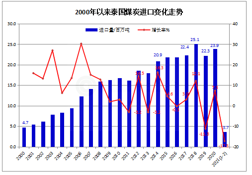 2021年2月,泰國煤炭進口189.8萬噸,同比下降22.7%。其中,煙煤及無煙煤進口188.4萬噸,同比下降21.8%;褐煤進口1.4萬噸,同比下降67.7%。