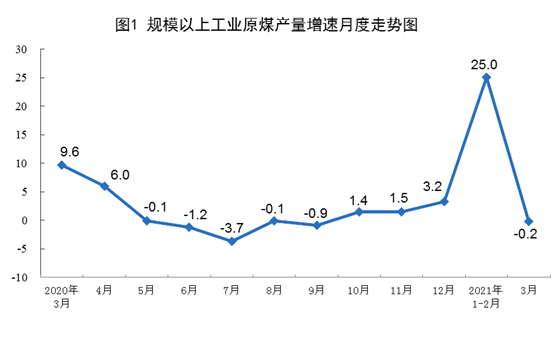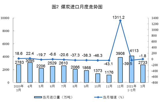 原煤生產小幅下降。3月份,生產原煤3.4億噸,同比下降0.2%,比2019年3月份增長9.4%,兩年平均增長4.6%,日均產量1099萬噸;進口煤炭2733萬噸,同比下降1.8%。