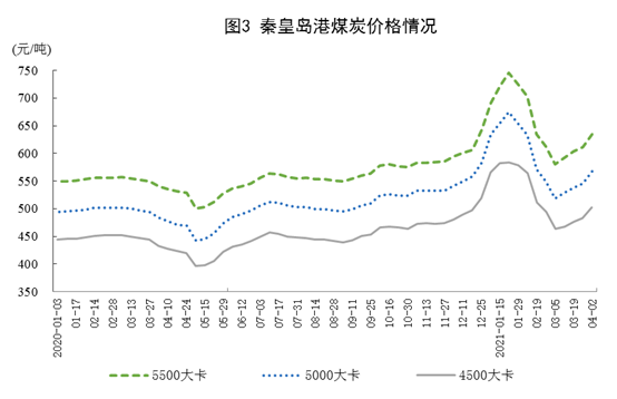 港口煤炭綜合交易價格有所上漲。4月2日,秦皇島港5500、5000和4500大卡煤炭價格分別為每噸634元、567元和502元,比3月5日分別上漲54元、49元和39元。