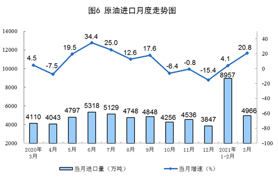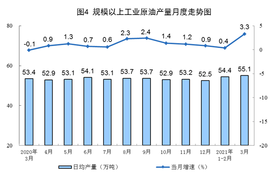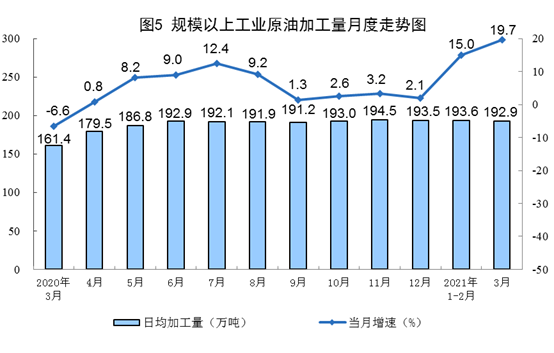 原油生產加快,加工量較快增長。3月份,生產原油1709萬噸,同比增長3.3%,比2019年3月份增長3.3%,兩年平均增長1.6%,日均產量55.1萬噸。加工原油5979萬噸,同比增長19.7%,比2019年3月份增長11.8%,兩年平均增長5.8%,日均加工192.9萬噸。