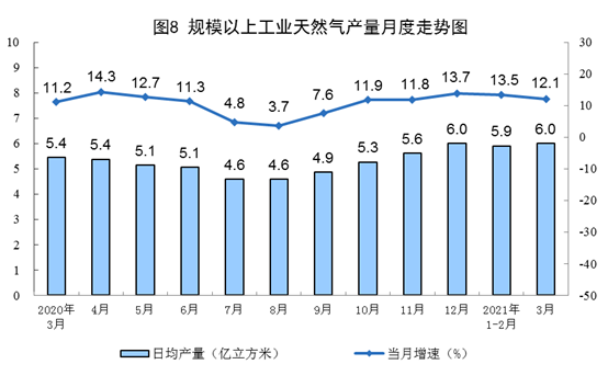 天然氣生產保持較快增長。3月份,生產天然氣185億立方米,同比增長12.1%,比2019年3月份增長24.7%,兩年平均增長11.7%,日均產量6.0億立方米。