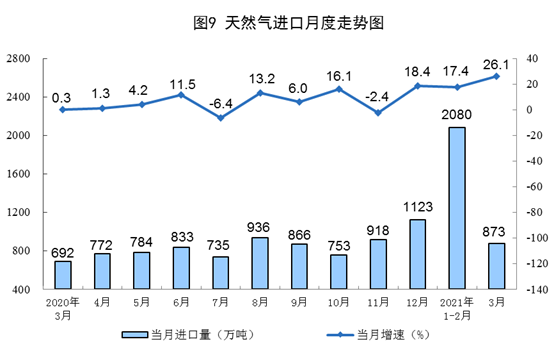 天然氣進口大幅增長。3月份,進口天然氣873萬噸,同比增長26.1%。一季度,進口天然氣2939萬噸,同比增長19.6%。