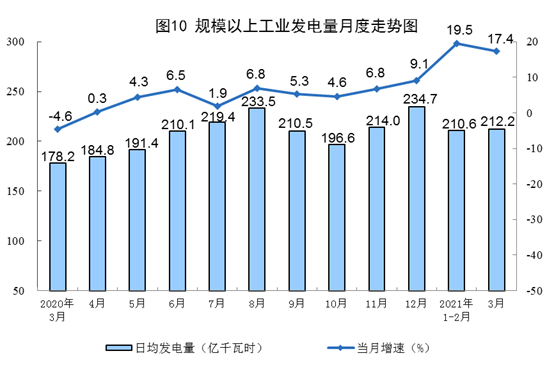 電力生產增長較快。3月份,發電6579億千瓦時,同比增長17.4%,比2019年3月份增長12.0%,兩年平均增長5.8%,日均發電212.2億千瓦時。一季度,發電19051億千瓦時,同比增長19.0%,比2019年一季度增長10.8%,兩年平均增長5.3%。