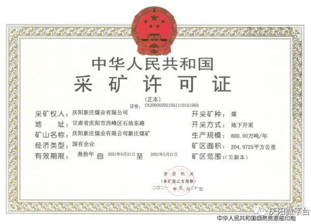 5月21日,甘肅省自然資源廳核發了慶陽新莊煤業有限公司新莊煤礦《采礦許可證》。