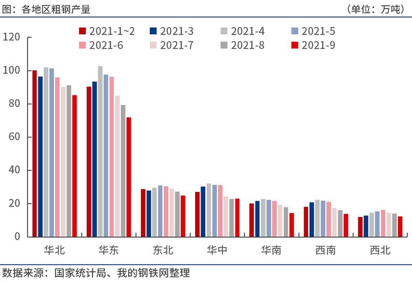 2021年9月份,華北、華東、東北、華南、西南、西北等地區(qū)粗鋼日均產(chǎn)量85.3萬(wàn)噸、72.0萬(wàn)噸、24.8萬(wàn)噸、14.4萬(wàn)噸、13.8萬(wàn)噸和12.4萬(wàn)噸,分別較上月減少5.9萬(wàn)噸、7.4萬(wàn)噸、2.4萬(wàn)噸、3.5萬(wàn)噸、2.2萬(wàn)噸和1.5萬(wàn)噸;華中地區(qū)粗鋼日均產(chǎn)量23.1萬(wàn)噸,較上月增加0.2萬(wàn)噸。