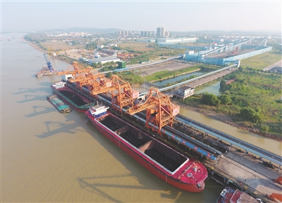 10月24日,在江西省九江市濂溪區(qū)的江西省煤炭?jī)?chǔ)備中心的長(zhǎng)江碼頭,工人正在將貨船上的電煤通過傳輸帶裝到鐵路專用線的貨物列車上。