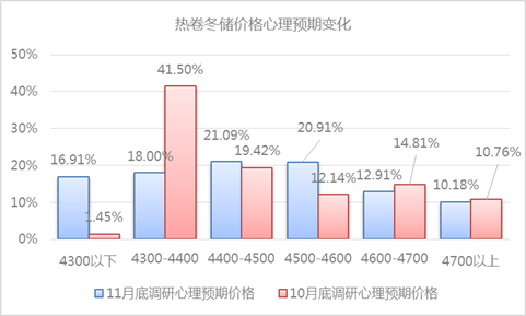 從本次調研數據看,熱卷市場商家冬儲心理預期價格更清晰,冬儲心理價位較上次調研價格心理價位上移100-200元/噸。