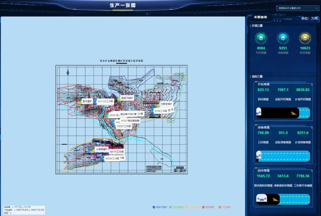 該項目的綜合展示“八個一”,構建彬長礦業“數字礦區—煤炭大腦”,實現產、供、銷業務聯動,人、財、物資源共享, 輔助產業決策。“生產一張圖”展示采掘工作面規劃與接續;“安全一把鎖”包含安全監測和安全預警;“設備一顆芯”掌握主要設備運行狀態;“供應一套碼”推進物資代儲代銷統一管理;“運銷一條鏈”詳知客戶及發運情況;“員工一覽表”綜合展示人力資源管理情況;“資金一個池”形成賬戶、存款、票據、貸款集中管理的司庫模式;“經營一盤棋”呈現生產經營全過程財務實時管理信息。