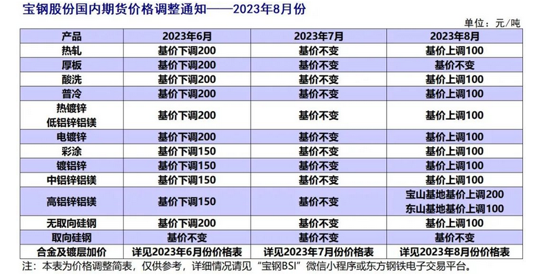 經(jīng)研究決定,寶鋼股份板材內(nèi)銷價格2023年8月份在7月份基礎(chǔ)上調(diào)整公告如下(以下除特殊注明外,均為不含稅):