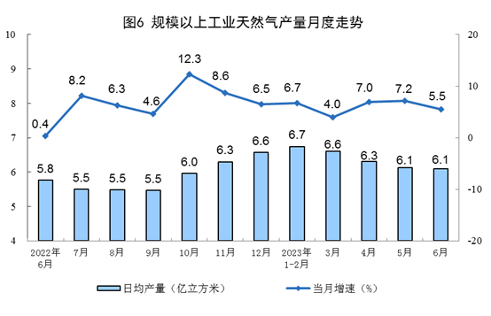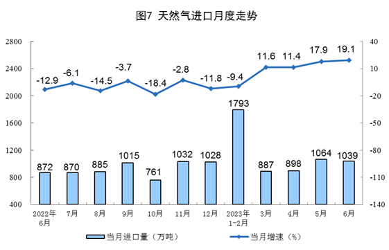 天然氣生產平穩增長,進口增速較快。上半年,生產天然氣1155億立方米,同比增長5.4%。進口天然氣5663萬噸,同比增長5.8%。6月份,生產天然氣183億立方米,同比增長5.5%。