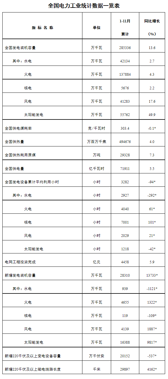 12月20日,國家能源局發(fā)布1-11月份全國電力工業(yè)統(tǒng)計(jì)數(shù)據(jù)。