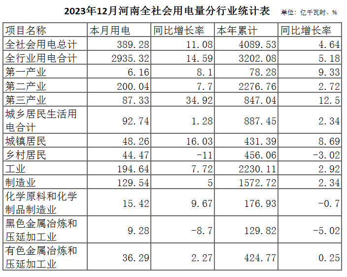 國家能源局河南監(jiān)管辦公室1月17日發(fā)布數(shù)據(jù)顯示,2023年12月份,河南省全省全社會用電量386.27億千瓦時,同比增加11.08%;1-12月累計用電量4089.53億千瓦時,同比增加4.64%。