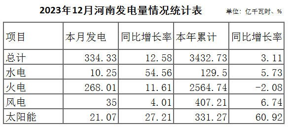發(fā)電量方面,12月份全省發(fā)電量334.33億千瓦時,同比增加12.58%;1-12月累計發(fā)電量3432.73億千瓦時,同比增加3.11%。