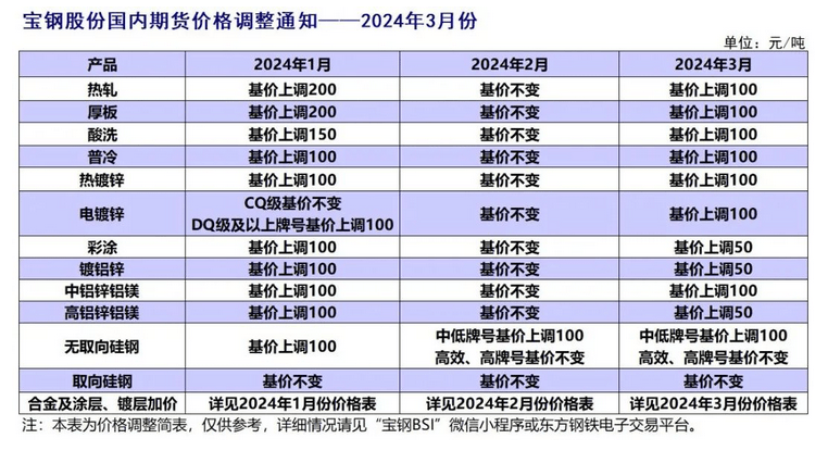 經研究決定,寶鋼股份板材內銷價格2024年3月份在2024年2月份基礎上調整公告如下(以下除特殊注明外,均為不含稅):