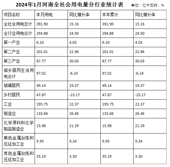 國家能源局河南監管辦公室3月15日發布數據顯示,2024年1月,河南省全省全社會用電量391.90億千瓦時,同比增加15.16%。