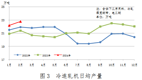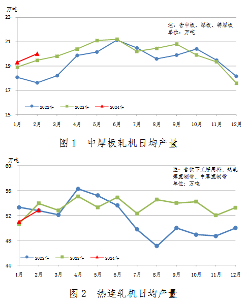 中厚板軋機、熱連軋機、冷連軋機日均產量變化見圖1、圖2、圖3。
