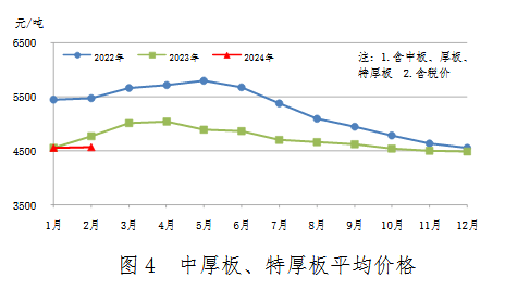 2月份,中厚板產量503萬噸,同比增加31萬噸,上升6.5%;銷售492萬噸,其中出口29萬噸,產銷率98.0%;售價4523元/噸,比上月上漲31元/噸。累計產量1027萬噸,同比增加50萬噸,上升5.1%。中厚板、特厚板平均價格見圖4。