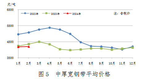 2月份,中厚寬鋼帶產量607萬噸,同比減少46萬噸,下降7.0%;銷售608萬噸,其中出口57萬噸,產銷率100.2%;售價4198元/噸,比上月上漲18元/噸。累計產量1267萬噸,同比減少50萬噸,下降3.8%。中厚寬鋼帶平均價格見圖5。
