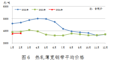 2月份,熱軋薄寬鋼帶產量231萬噸,同比增加9萬噸,上升3.9%;銷售223萬噸,其中出口29萬噸,產銷率96.5%;售價4306元/噸,比上月上漲44元/噸。累計產量471萬噸,同比增加26萬噸,上升5.8%。熱軋薄寬鋼帶均價見圖6。