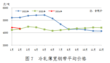 2月份,冷軋薄寬鋼帶產量352萬噸,同比增加45萬噸,上升14.7%;銷售327萬噸,其中出口14萬噸,產銷率92.9%;售價4839元/噸,比上月下跌89元/噸。累計產量708萬噸,同比增加63萬噸,上升9.8%。冷軋薄寬鋼帶平均價格見圖7。