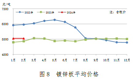 2月份,鍍鋅板產量211萬噸,同比增加18萬噸,上升9.4%;銷售206萬噸,其中出口18萬噸,產銷率97.6%;售價5553元/噸,比上月下跌6元/噸。累計產量437萬噸,同比增加31萬噸,上升7.7%。鍍鋅板平均價格見圖8。