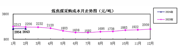 對(duì)標(biāo)企業(yè)煉焦煤2月份加權(quán)平均折算成干基的采購(gòu)成本為2063.23元/噸,環(huán)比升高9.17元/噸,升幅為0.45%。1-2月累計(jì)平均折算成干基的采購(gòu)成本為2061.16元/噸,同比下降225.34元/噸,降幅為9.86%。