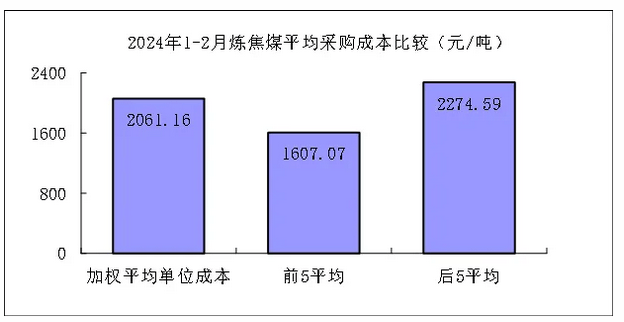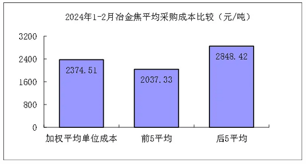 1-2月對(duì)標(biāo)企業(yè)冶金焦平均采購(gòu)成本最低的前5家企業(yè)的加權(quán)平均采購(gòu)成本為2037.33元/噸,比對(duì)標(biāo)企業(yè)平均采購(gòu)成本低337.18元/噸,低于平均采購(gòu)成本14.20%;而采購(gòu)成本最高的5家企業(yè)的加權(quán)平均采購(gòu)成本為2848.42元/噸,比對(duì)標(biāo)企業(yè)平均采購(gòu)成本高473.90元/噸,高于平均采購(gòu)成本19.96%。