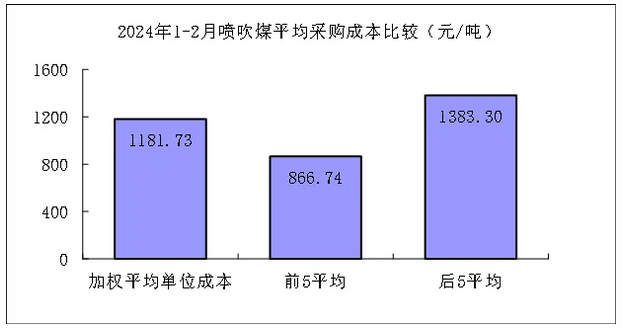 1-2月對(duì)標(biāo)企業(yè)噴吹煤平均采購(gòu)成本最低的前5家企業(yè)折算成干基的加權(quán)平均采購(gòu)成本為866.74元/噸,比對(duì)標(biāo)企業(yè)平均采購(gòu)成本低314.99元/噸,低于平均采購(gòu)成本26.66%;而采購(gòu)成本最高的5家企業(yè)的加權(quán)平均采購(gòu)成本為1383.30元/噸,比對(duì)標(biāo)企業(yè)平均采購(gòu)成本高201.57元/噸,高于平均采購(gòu)成本17.06%。