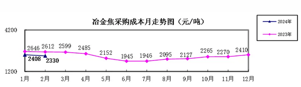 冶金焦2月份加權(quán)平均折算成干基的采購(gòu)成本2330.35元/噸,環(huán)比下降77.16元/噸,降幅為3.20%。1-2月累計(jì)平均折算成干基的采購(gòu)成本為2374.51元/噸,同比下降255.11元/噸,降幅為9.70%。