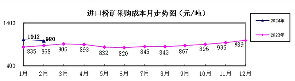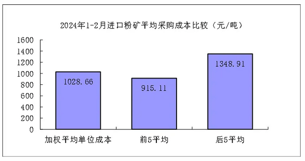 進(jìn)口粉礦2月份加權(quán)平均采購(gòu)成本980.04元/噸,環(huán)比下降32.41元/噸,降幅為3.20%。1-2月累計(jì)平均采購(gòu)成本為990.39元/噸,同比升高139.04元/噸,升幅為16.33%。