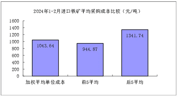 1-2月對(duì)標(biāo)企業(yè)進(jìn)口粉礦折算成62%品位的平均采購(gòu)成本為1028.66元/噸,成本最低的前5家企業(yè)的加權(quán)平均采購(gòu)成本為915.11元/噸,比對(duì)標(biāo)企業(yè)平均采購(gòu)成本低113.55元/噸,低于平均采購(gòu)成本11.04%;而采購(gòu)成本最高的5家企業(yè)加權(quán)平均采購(gòu)成本為1348.91元/噸,比對(duì)標(biāo)企業(yè)平均采購(gòu)成本高320.25元/噸,高于平均采購(gòu)成本31.13%。