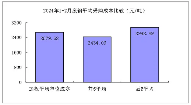 1-2月對(duì)標(biāo)企業(yè)廢鋼平均采購(gòu)成本最低的前5家企業(yè)的加權(quán)平均采購(gòu)成本為2434.03元/噸,比對(duì)標(biāo)企業(yè)平均采購(gòu)成本低245.64元/噸,低于平均采購(gòu)成本9.17%;而采購(gòu)成本最高的5家企業(yè)加權(quán)平均采購(gòu)成本為2942.49元/噸,比對(duì)標(biāo)企業(yè)平均采購(gòu)成本高262.82元/噸,高于平均采購(gòu)成本9.81%。