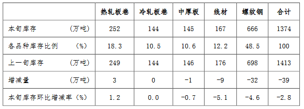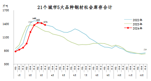 3月下旬,21個城市5大品種鋼材社會庫存1374萬噸,環比減少39萬噸,下降2.8%,庫存繼續下降;比2月下旬增加7萬噸,上升0.7%;比年初增加645萬噸,上升88.5%;比上年同期增加143萬噸,上升11.6%。