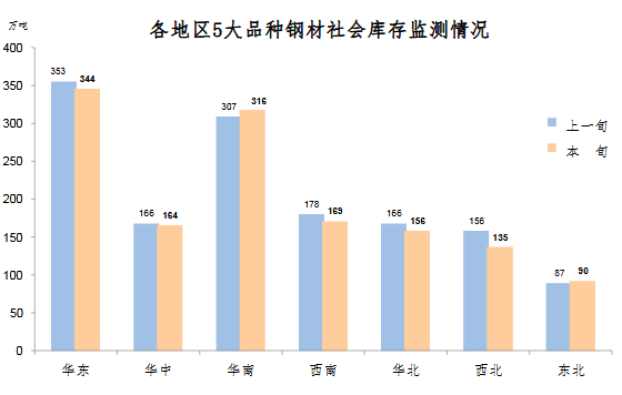 3月下旬,分地區來看,七大區域庫存環比各有升降,具體情況為:西北庫存環比減少21萬噸,下降13.5%,為減量和降幅最大地區;華北減少10萬噸,下降6.0%;西南和華東減量均為9萬噸,分別下降5.1%和2.5%;華中減少2萬噸,下降1.2%;華南增加9萬噸,上升2.9%;東北增加3萬噸,上升3.4%。