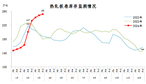 3月下旬,熱軋板卷庫存252萬噸,環比增加3萬噸,上升1.2%,庫存連續9旬上升;比2月下旬增加19萬噸,上升8.2%;比年初增加108萬噸,上升75.0%;比上年同期增加72萬噸,上升40.0%。