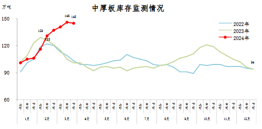3月下旬,中厚板庫存145萬噸,環比減少1萬噸,下降0.7%,庫存連續8旬上升后小幅下降;比2月下旬增加8萬噸,上升5.8%;比年初增加51萬噸,上升54.3%;比上年同期增加44萬噸,大幅上升43.6%。