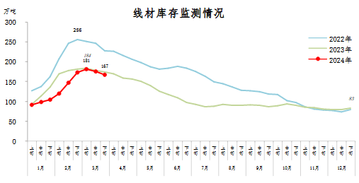 3月下旬,線材庫存167萬噸,環比減少9萬噸,下降5.1%,庫存繼續下降;比2月下旬減少6萬噸,下降3.5%;比年初增加84萬噸,上升101.2%;比上年同期減少7萬噸,下降4.0%。