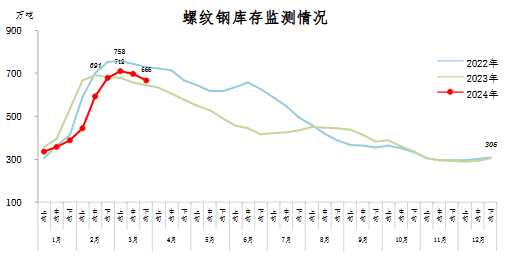 3月下旬,螺紋鋼庫存666萬噸,環比減少32萬噸,下降4.6%,庫存下降速度有所加快;比2月下旬減少15萬噸,下降2.2%;比年初增加361萬噸,上升118.4%;比上年同期增加22萬噸,上升3.4%。