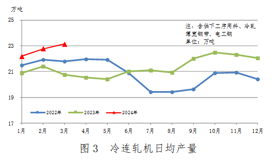 3月份生產(chǎn)717萬(wàn)噸,同比增加74萬(wàn)噸,上升11.5%;其中商品量483萬(wàn)噸,同比增加48萬(wàn)噸,上升10.9%;供下工序用料234萬(wàn)噸,同比增加27萬(wàn)噸,上升12.8%。冷連軋機(jī)累計(jì)生產(chǎn)2066萬(wàn)噸,同比增加175萬(wàn)噸,上升9.2%。