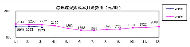 對標企業煉焦煤3月份加權平均折算成干基的采購成本為1973.49元/噸,環比下降89.73元/噸,降幅為4.35%。1-3月累計平均折算成干基的采購成本為2037.04元/噸,同比下降230.50元/噸,降幅為10.17%。