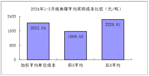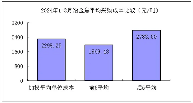1-3月對標企業冶金焦平均采購成本最低的前5家企業的加權平均采購成本為1969.48元/噸,比對標企業平均采購成本低328.77元/噸,低于平均采購成本14.31%;而采購成本最高的5家企業的加權平均采購成本為2783.50元/噸,比對標企業平均采購成本高485.26元/噸,高于平均采購成本21.11%。