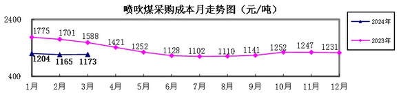 噴吹煤3月份加權平均折算成干基的采購成本為1172.85元/噸,環比升高7.58元/噸,升幅為0.65 %。1-3月累計平均折算成干基的采購成本為1180.09元/噸,同比下降509.48元/噸,降幅為30.15%。